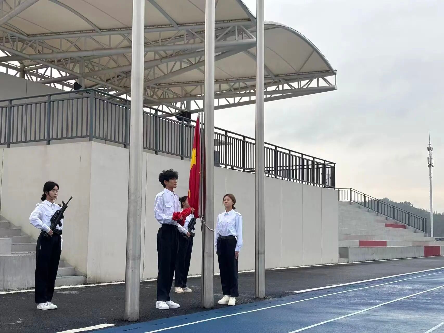 国旗护卫队步履铿锵,护送五星红旗庄严入场。全体师生肃立致敬,高唱国歌。伴随着激昂旋律,五星红旗冉冉升起,在晨光中迎风飘扬,凝聚着师生对祖国的赤诚热爱与对新征程的坚定信念。