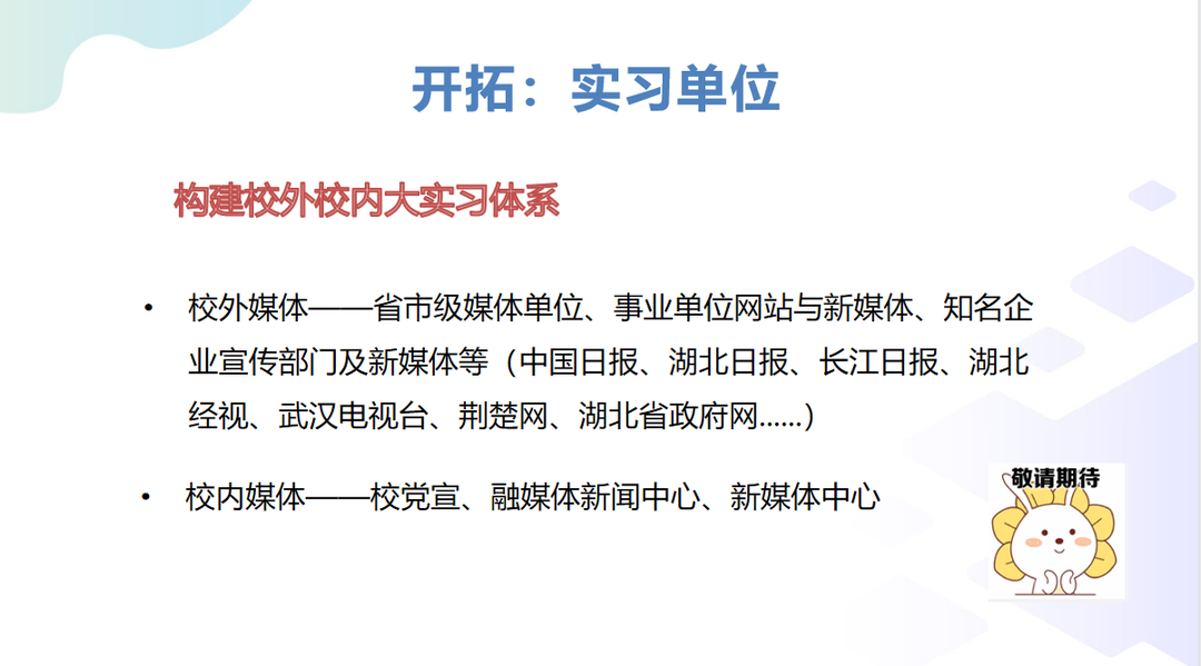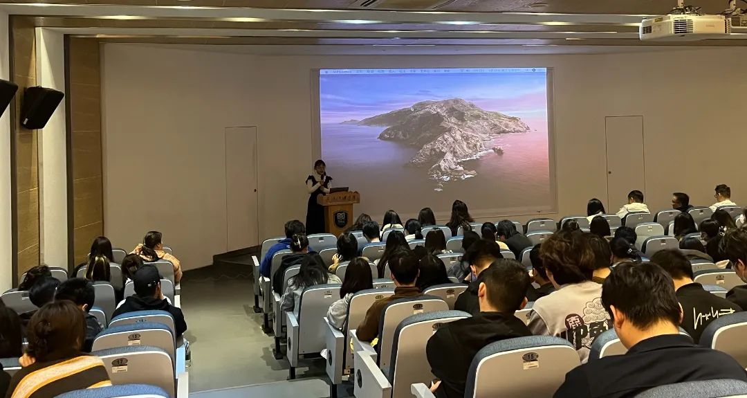 在各位新小传们进入大三下学期的课程后就会更加切身体验这个项目的具体流程,在学院带领下实现“课程——实习——就业”的有效联动。紧接着,杨郡媚老师也对在座的参会学生进行了问卷调查的互动,对于“心仪的校外岗位”、”对于校外岗位的志向”等进行大致的了解。在实习老师们提出对于大实习流程的注意事项后,我们也迎来了此次会议的下一个环节——实习代表的心得分享。